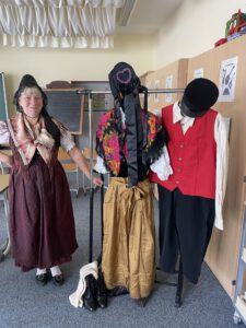 Die Trachten auf dem Foto für die Frau und den Mann sind nachgeschneidert und wurden um die 1990er von der Trachtengruppe Schöneck getragen. Diese Leihgabe erhielten wir über Angelika Thiem, die als Museumsleiterin des Heimatmuseums Schöneck, die Schüler der Klassen 3 und 4 zu einem interessanten Ausflug in die Geschichte der Stadt Schöneck entführte. Es war sehr schön, dort vor Ort gewesen zu sein.